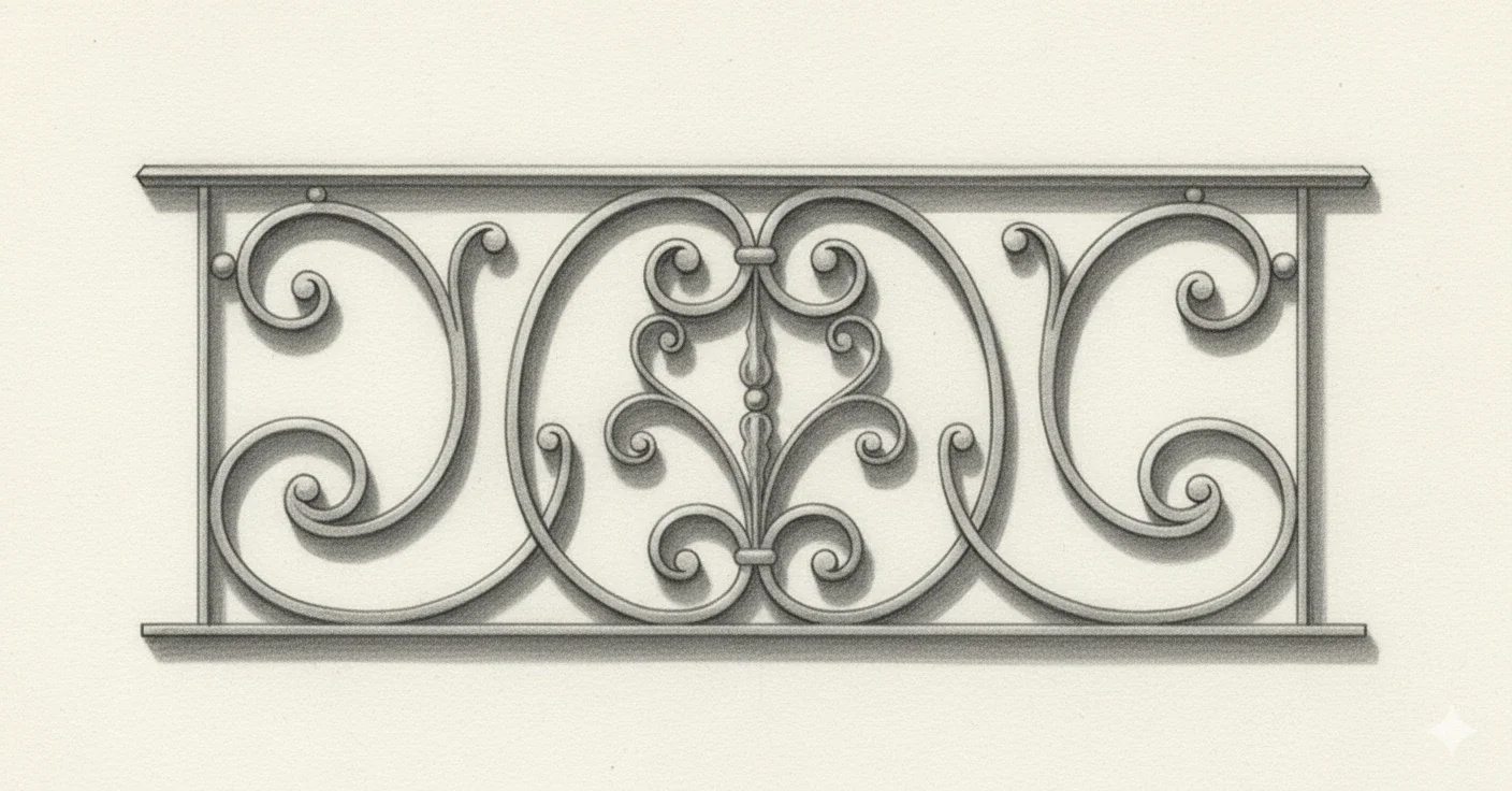 Au cœur de ce design unique, un motif central élégant inspiré de la fleur-de-lys s'épanouit avec grâce. Il est encadré par un arrangement harmonieux de grandes volutes en forme de "C" en fer plat forgé, qui dessinent des courbes fluides et équilibrées. Issues d'un savoir-faire artisanal, ces lignes dynamiques créent une composition visuellement élégante et intemporelle. Les billes discrètes intégrées aux intersections soulignent la minutie de la fabrication, offrant un équilibre parfait entre tradition et raffinement. Chaque détail de votre garde-corps Arras témoigne d'une ferronnerie d'art exceptionnelle.
