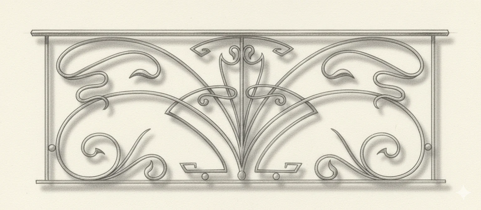 Au cœur de ce design unique, un motif central végétal et stylisé s'épanouit avec grâce, reflétant l'esthétique caractéristique de l'Art Nouveau. Il est encadré par des volutes fluides en fer plat forgé qui dessinent des courbes harmonieuses et équilibrées. Issues d'un savoir-faire artisanal, ces lignes dynamiques créent une composition visuellement légère et raffinée. L'absence de médaillon horizontal et de billes discrètes (à l'exception de celles aux extrémités des traverses) accentue la pureté du design et la focalisation sur le motif central. Chaque détail de votre garde-corps Chambly témoigne d'une ferronnerie d'art exceptionnelle.