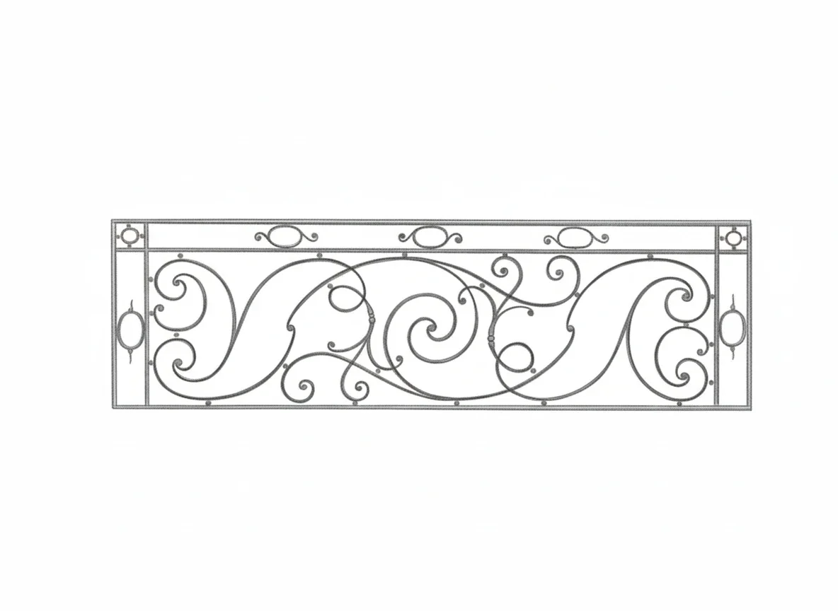 Le motif central du garde-corps Julia est constitué de nombreuses volutes à noyaux affinés en fer plat qui s'entrecroisent, formant un ensemble complexe et élégant. Ce motif part d'un noyau central d'où émergent deux volutes principales en fer carré, créant un point focal harmonieux et esthétique. Les volutes, finement travaillées, s'entrelacent avec grâce, formant un motif symétrique qui capte l'œil et ajoute une touche de sophistication à votre espace. Ce motif central, avec ses volutes et ses noyaux affinés, est un autre mot-clé crucial qui peut attirer les visiteurs intéressés par des designs élégants et sophistiqués.