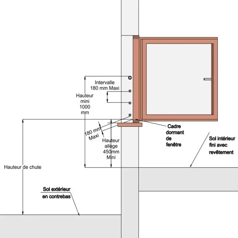 Un dispositif de protection est requis dès lors qu’une fenêtre présente une hauteur de chute supérieure à 1 mètre par rapport au sol extérieur.